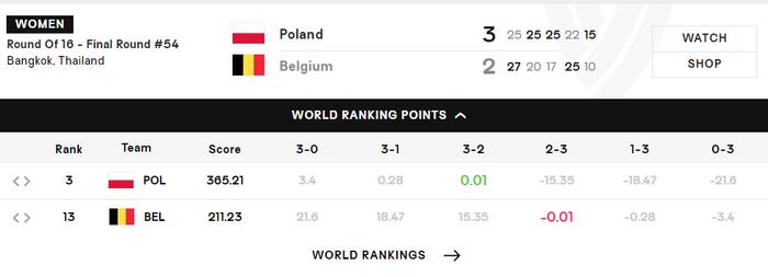 2025年女排世锦赛1/8决赛,比利时女排2-3不敌波兰女排无缘八强,五局比分:27-25、20-25、17-25、25-22、10-15。也就是说比利时女排是在大比分1-0领先的情况下被连扳两局,第四局涉险过关拖入决胜局,但决胜局呈现了一边倒的态势。
